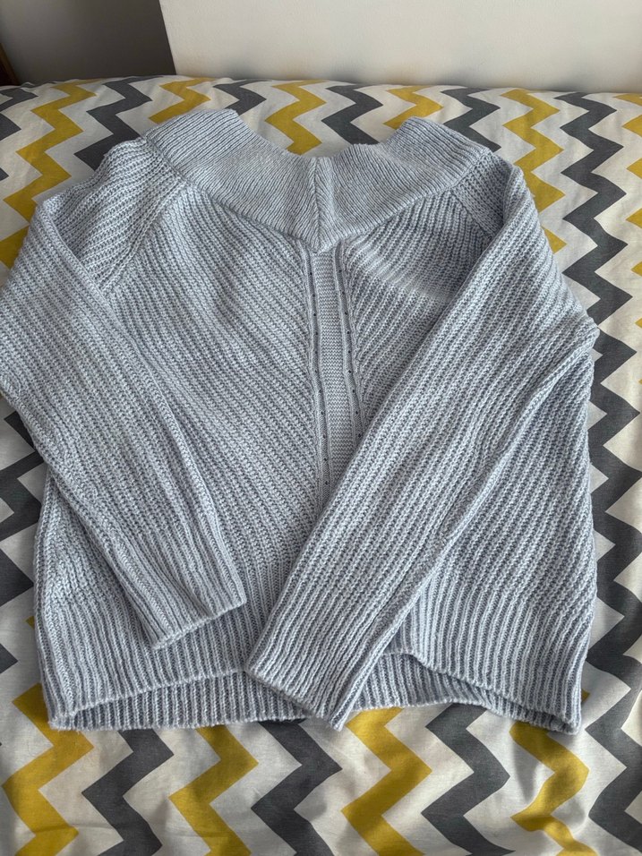 Mavi renkte, kayık yaka ve uzun kollu triko kazak. Yumuşak örme kumaştan, salaş kesim ve desensiz, günlük kullanıma uygun rahat bir model.