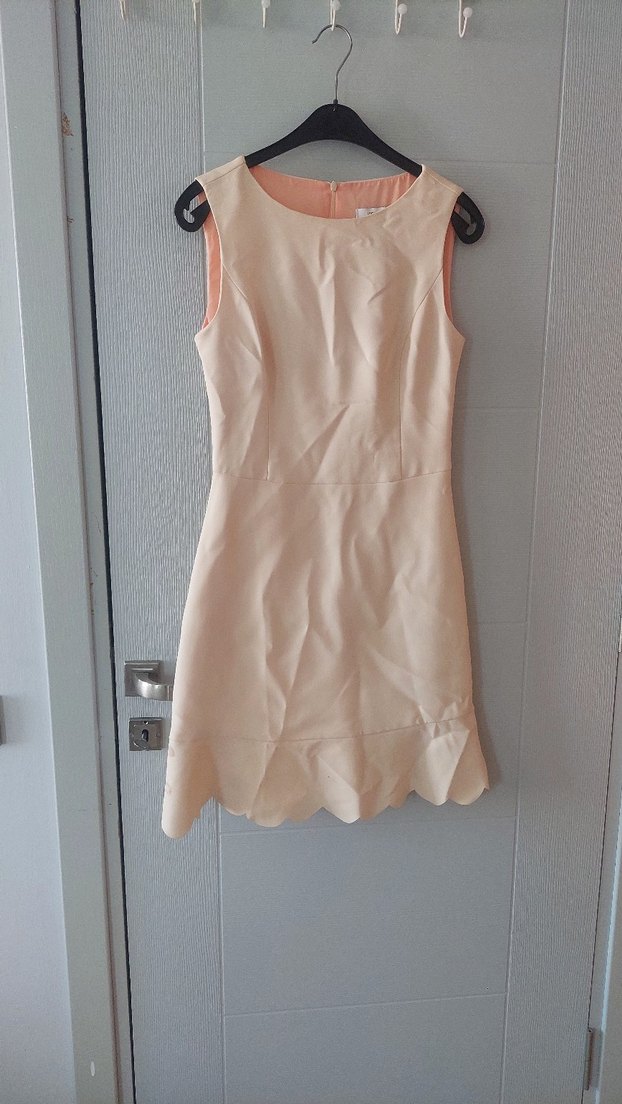 Kolsuz, V yaka ve etek kısmında fırfır detaylı pudra midi elbise. Düz ve hafif parlak sentetik kumaştan, günlük kullanıma uygun.