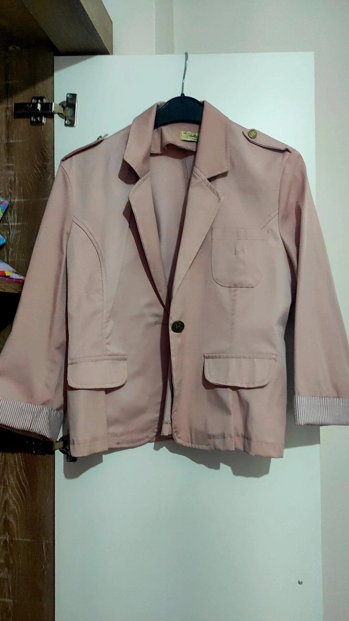 Pudra renkte, düğmeli midi uzunlukta kadın ceket. Notlu yaka ve uzun kollu, düz. 46 beden yazıyor ama 46 beden gibi değil küçük 38/40/42 uyumludur.