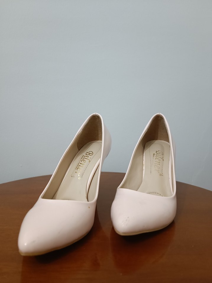 pudra, minimalist tasarımlı, kauçuk malzemeden yapılmış stiletto topuklu ayakkabılar. Modern klasik stil, ofis için uygun, desensiz ve zahmetsiz şıklık sunar.