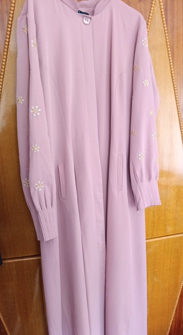 pudra renkli, uzun ve bol kesim kadın ferace uzun kollu ve nakışlı çiçek desenleriyle minimalist tarz için uygundur.