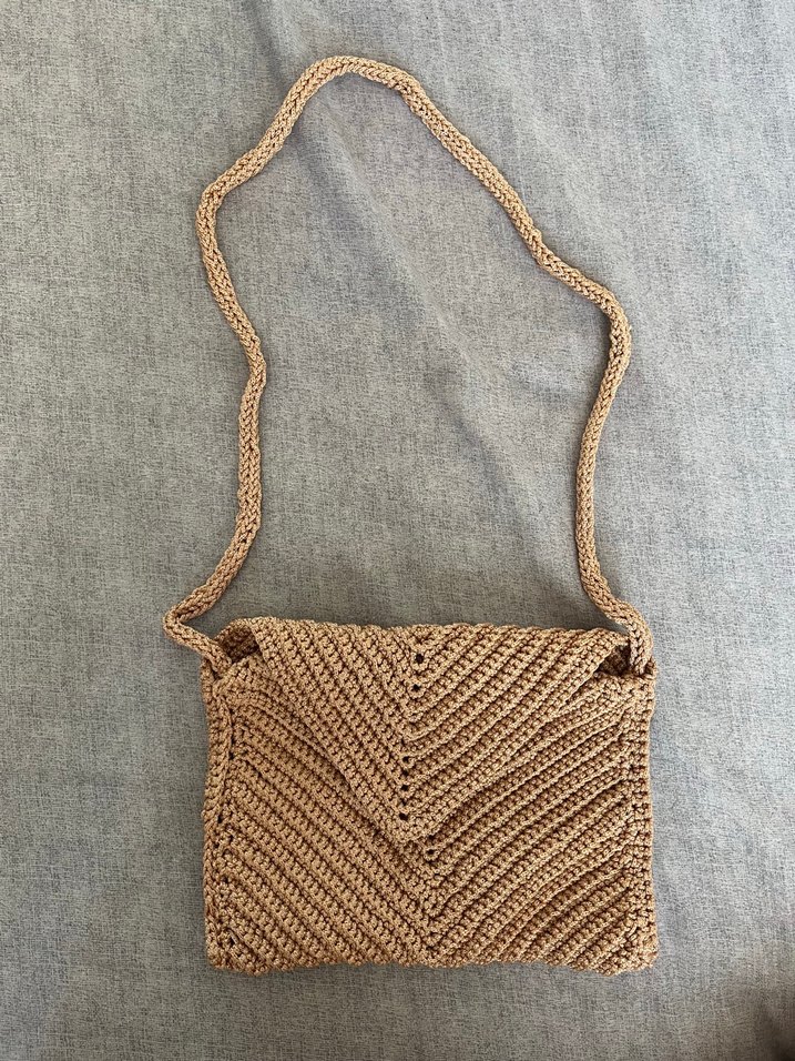Pudra renkte, örgü dokulu kadın çantası, bohem tarzda, günlük kullanıma uygun rahat bir tasarıma sahiptir.