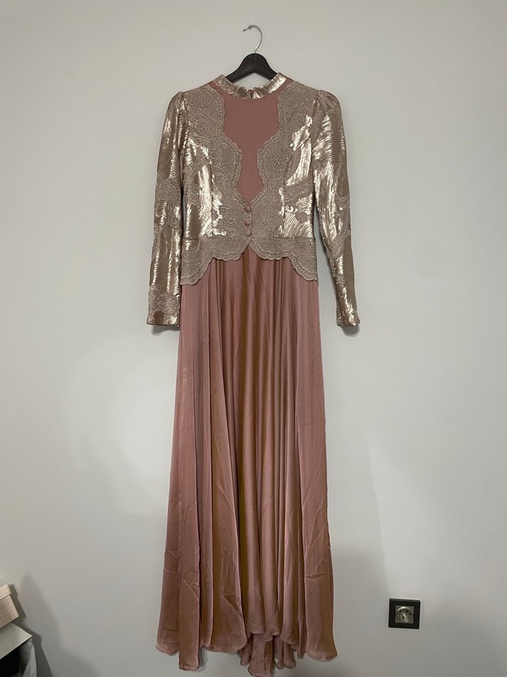 Pudra renkli, parlak işlemeli, drapeli uzun abiye elbise. Uzun kollu, yüksek yakalı ve bol kesimdir. Düğünler için uygundur. ✨ Minel Aşk markasına ait , arkası önünden hafif uzun olan harika bir abiye elbise