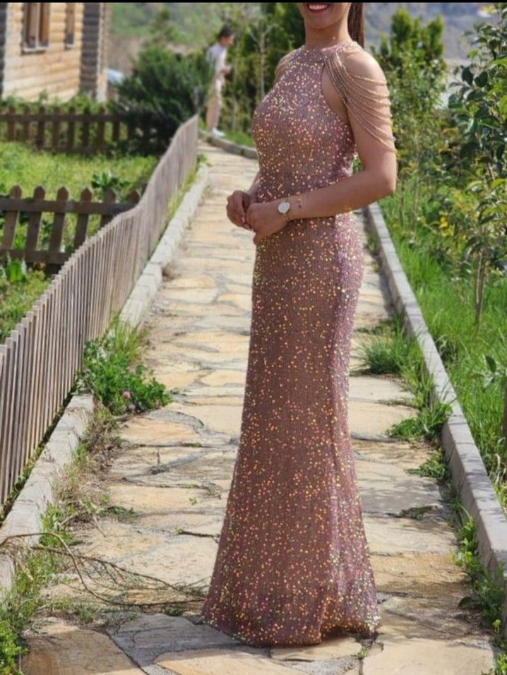 Pudra ve pembe parlak pullarla süslenmiş, kollarda taş detaylı, halter yaka ve vücuda oturan uzun abiye elbisedir. ✨