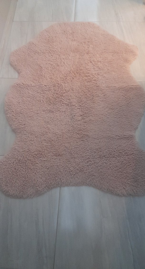 Modern tarzda, pastel pudra renkte, düzensiz şekilli ve yumuşak dokulu, desensiz halı. az kulanıldı cok şık boyu 140 enı 1m