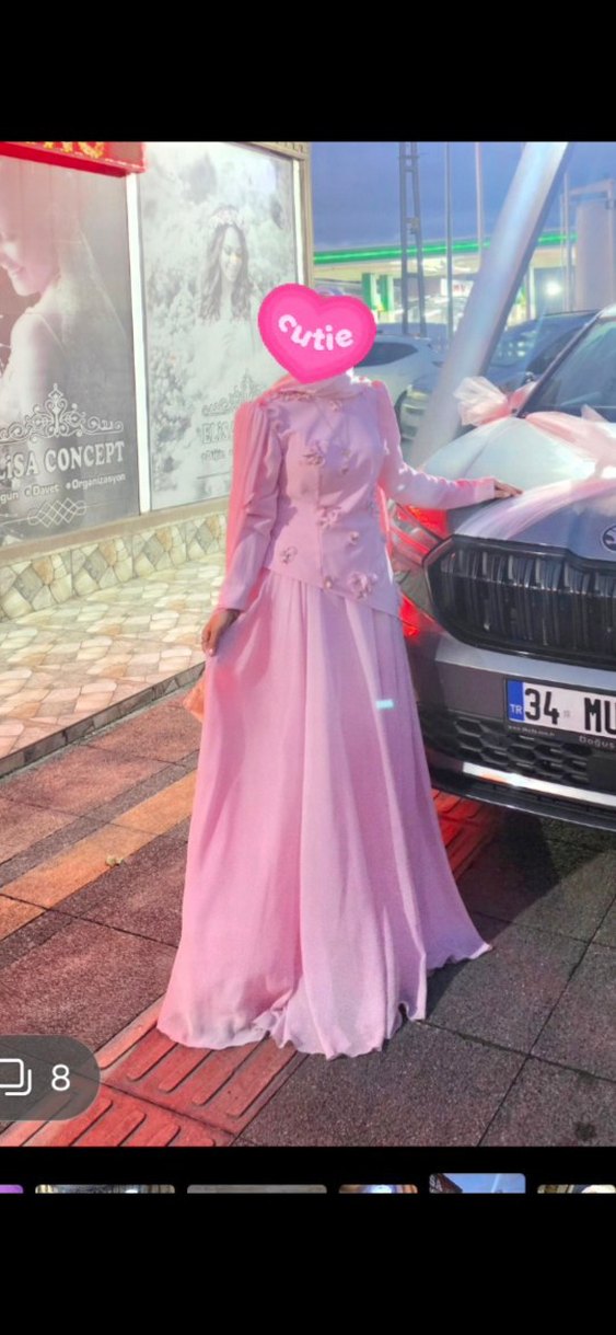 özel gün mezuniyet davet Pudra renkli, uzun boy, pelerin detaylı, yüksek yakalı ve bol kesim kadın abiyesi.