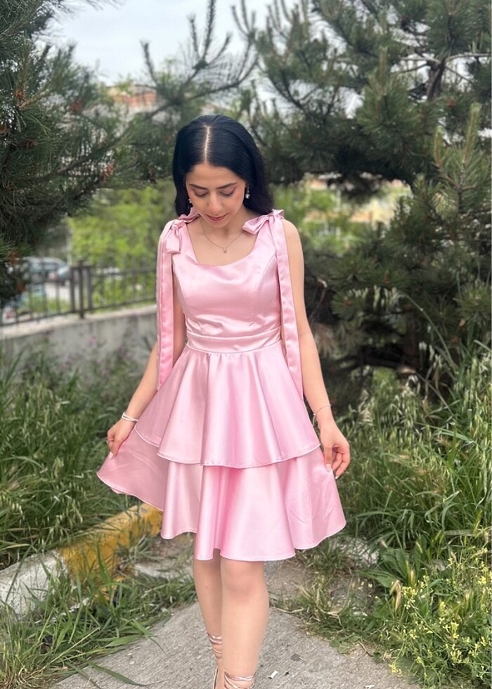 saten kısa toz pembe/pudra abiye. hiçbir defo,kusur yoktur. 1 kere mezuniyette giyildi. kollardaki kurdaleler dikilidir ama çıkarılabilir. terzi masrafı olduğu için pazarlık az yapılacaktır. xs/s rahat olur.