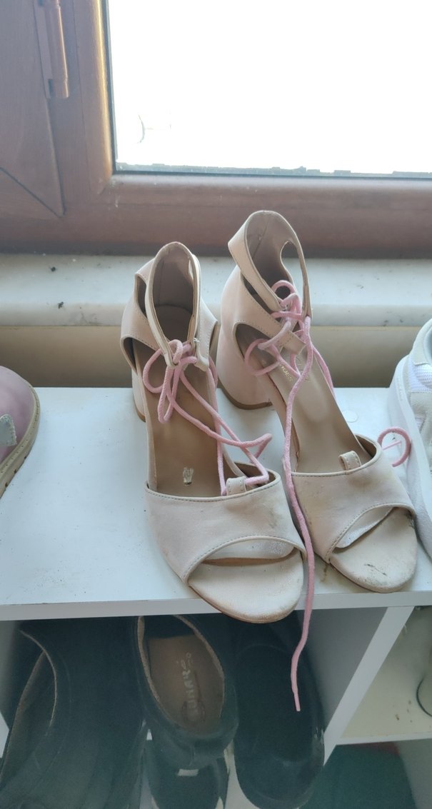 Pastel pembe bağcıklı, ince topuklu ve açık burunlu kadın ayakkabısı. Kauçuk malzemeden, bohem tarzda, düğün için uygun. sağlam ürün sadece temizlenmesi gerek hiç bri sorunu yok