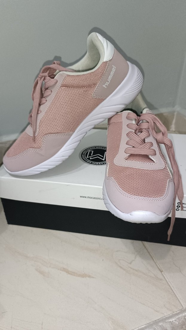 Pastel pudra pembe renkte, bağcıklı ve blok topuklu kadın spor ayakkabısıdır. Yumuşak kauçuk tabanlı, spor ve sokak stilini birleştirir.