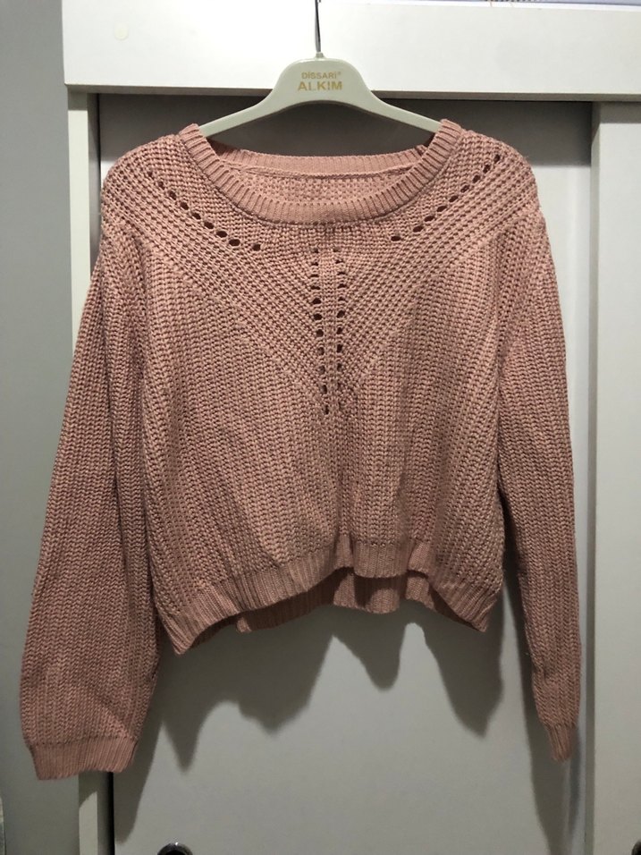 Pudra pembe renkte, bohem tarzda, yuvarlak yakalı ve uzun kollu örgü kadın kazak. Rahat kesimi ve yumuşak dokusuyla günlük kullanıma uygundur.