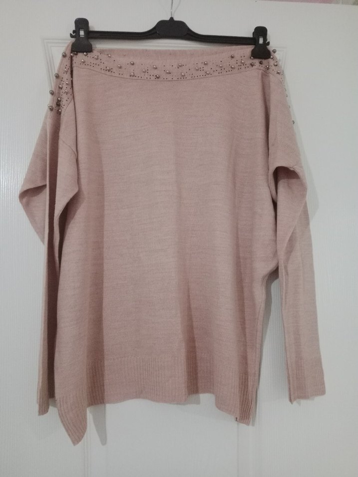pudra pembe renkli, uzun kollu, kayık yakalı, salaş kesim triko kazak. Omuzlarda boncuk detayları bulunur, rahat ve günlük kullanıma uygundur.