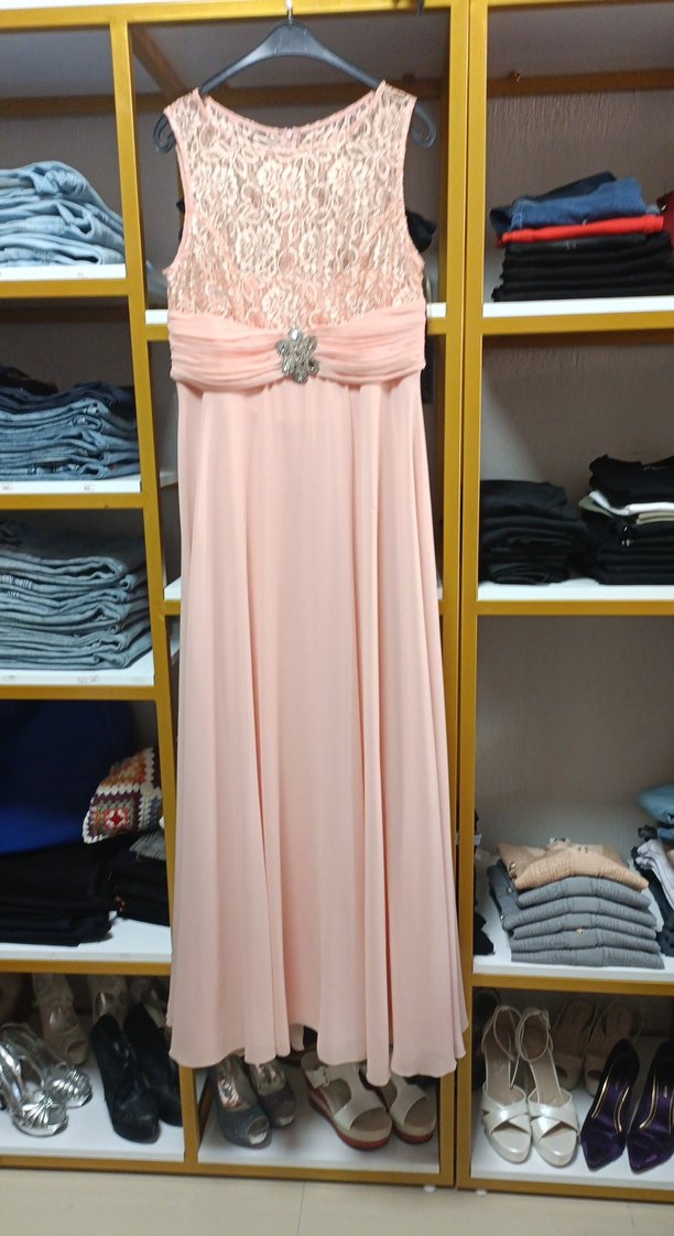Pudra pembesi uzun abiye elbise, straplez yakalı ve kolsuzdur. Belde drape detay ve süslü broş bulunur. Klasik ve modern tarzı birleştirir.
