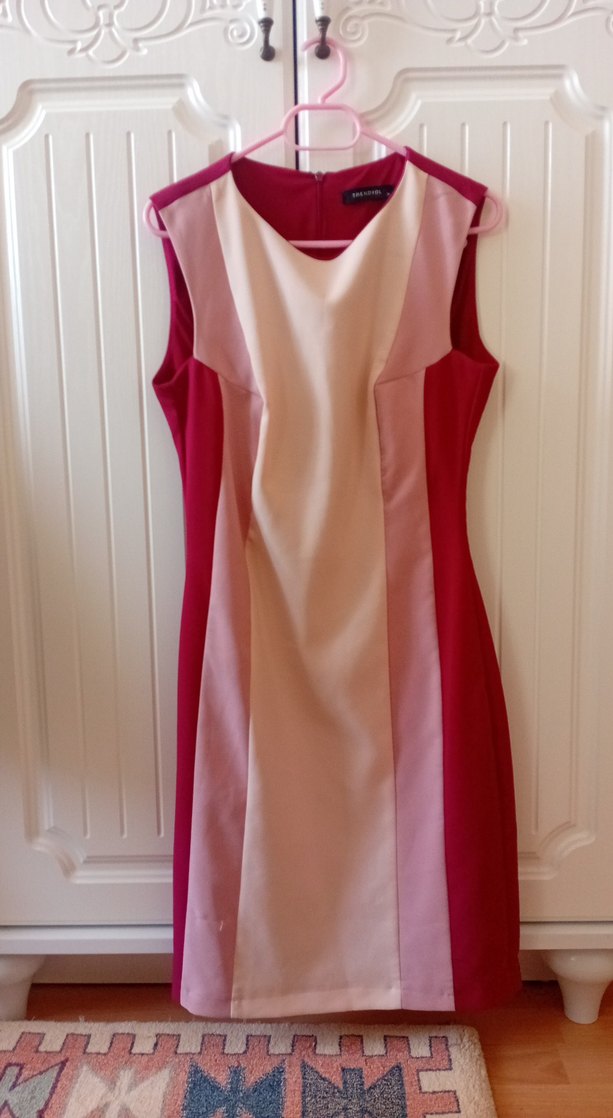 Yumuşak sentetik kumaştan yapılmış, pastel pembe tonlarında drapeli kolsuz kalem elbise. Askısız yaka ve normal kesimle modern klasik ofis stiline uygun.