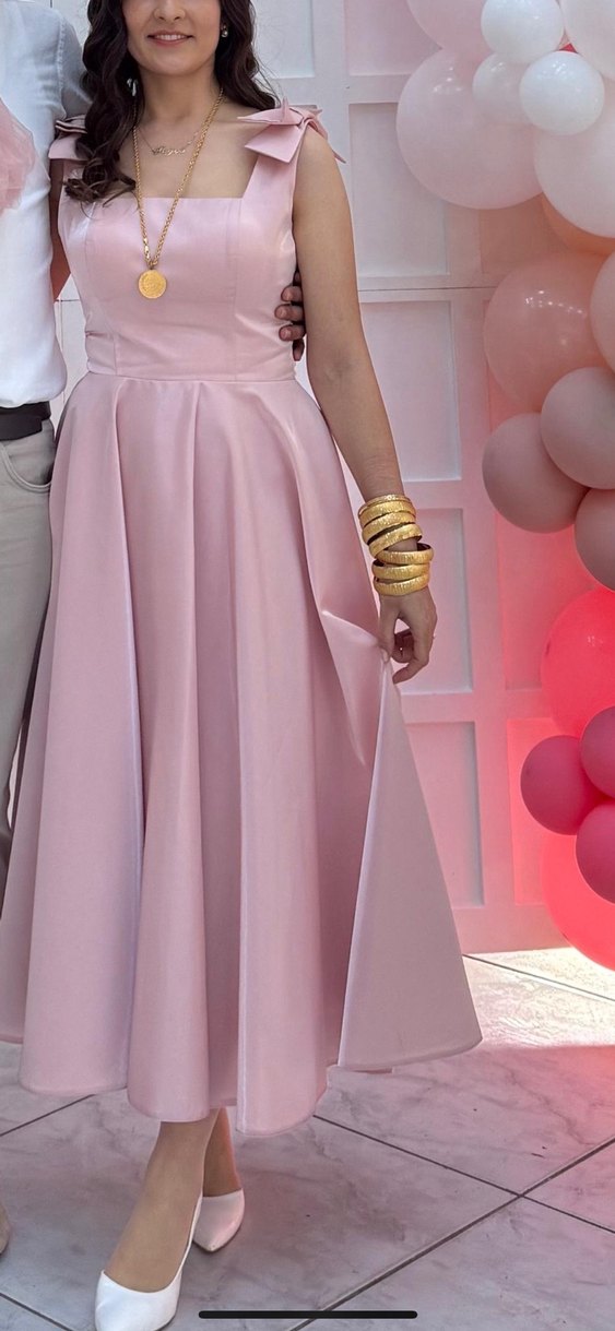 Pudra pembesi, kare yaka ve drapeli tasarımıyla uzun, fitted abiye elbise. Kalın askılı kollu, modern klasik tarzda, düğün için uygun. Ben bebek mevlidinde kullandım ama söz nişan isteme için uygun. Sadece 1 kez 2 saatlik giyildi. Sıfır elbise, ben mağaza fiyatı 4250