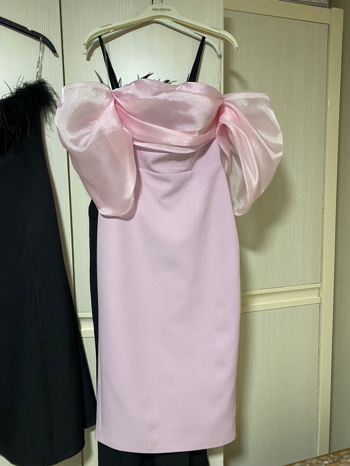 Bu pudra pembe midi abiye elbise, straplez yakalı ve drapeli, ince askılı kolları ile parti için uygundur Sadece 1 kez giyildi.