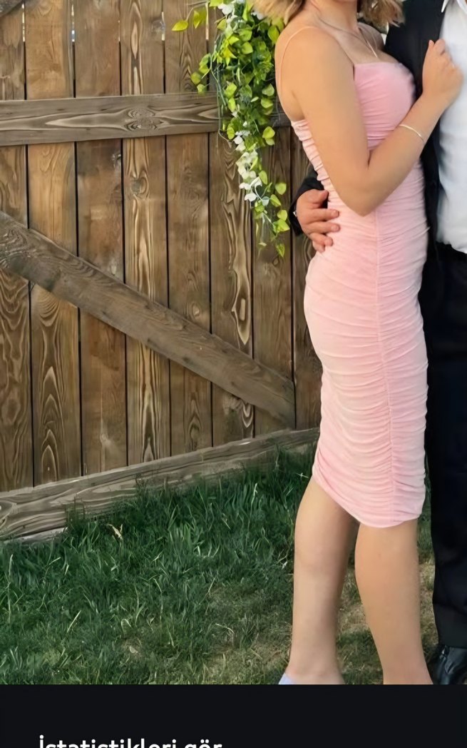 Pudra pembe, straplez ve ince askılı, drapeli detaylara sahip, vücuda oturan midi uzunlukta elbisedir. Düğünler için uygundur.