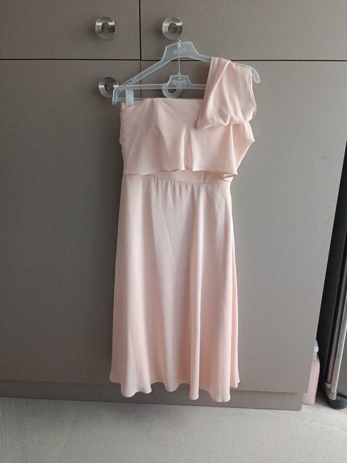 Pudra pembesi renkli, askısız, tek omuz drapeli mini abiye elbise, salaş kesimiyle modern klasik tarz sunar. Düğün için uygundur.