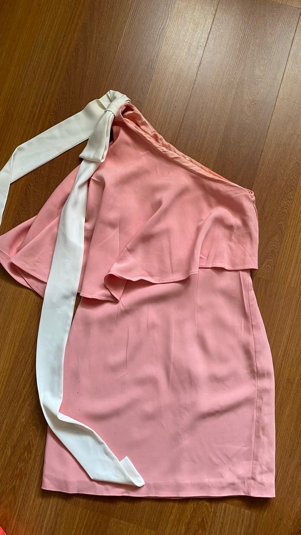 Pudra pembesi, straplez yakalı, drapeli ve askılı kollu İpek gibi yumuşak kumaş, midi boy ve bol kesimle romantik akşamlar için ideal.