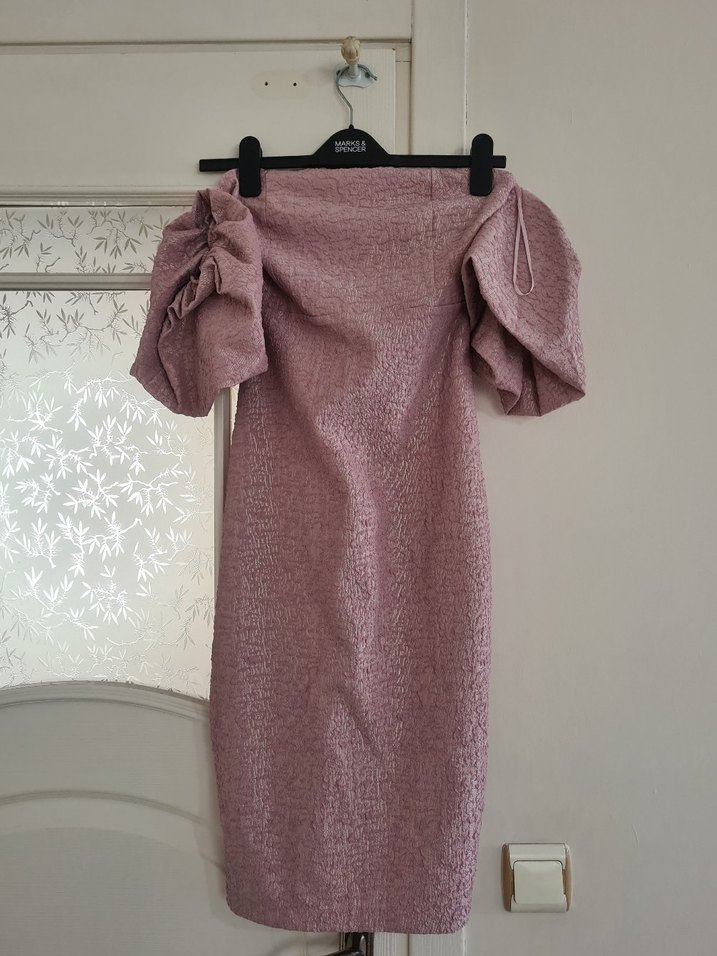 Pudra pembe, drapeli kısa kollu, straplez ve vücuda oturan midi elbise. Modern klasik tarzıyla romantik akşamlar için uygun.