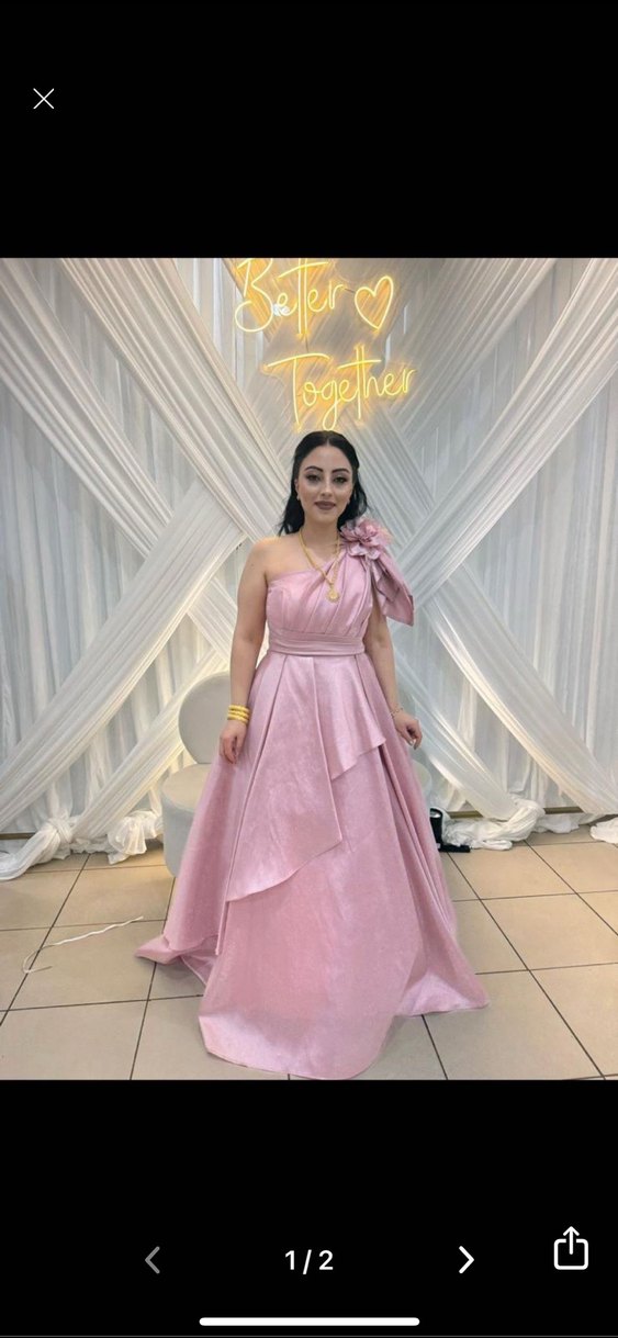 Pudra pembe, straplez, drapeli uzun abiye elbise, baskılı deseni ve regular kesimiyle modern klasik tarzda düğünler için uygundur.
