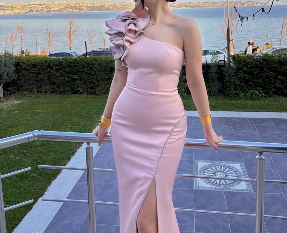 Pudra pembesi, straplez ve drapeli detaylı, uzun boylu, yan yırtmaçlı şık abiye elbise. Bir kez giyilmiştir temiz üründür. 170-65 kg için uygun 38-40 beden arası