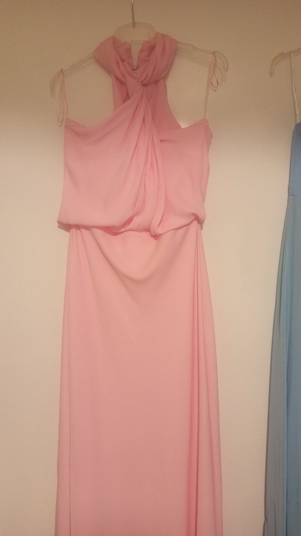 Pudra pembe, straplez ve drapeli tasarıma sahip uzun, dar kesim ve kolsuz elbise. Minimalist ve çağdaş tarzda, düğünler için uygun.