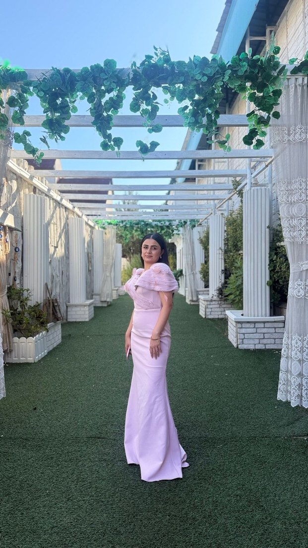 Pudra pembesi uzun abiye elbise, straplez yaka ve kısa kollu drapeli tasarıma sahiptir. Düğünler için uygun, normal kesim ve desensiz, klasik şıklık sunar.