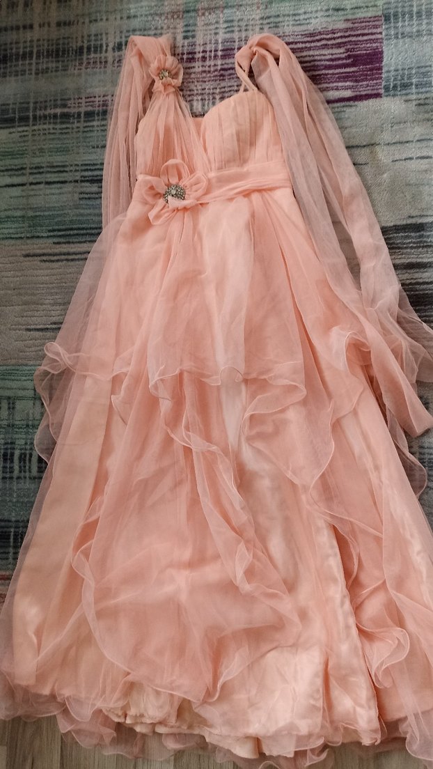 Askılı, kolsuz, bol kesim ve drapeli tasarıma sahip pudra pembe abiye elbise. Bohem tarzı ve uzun boyuyla şık düğünler için ideal.