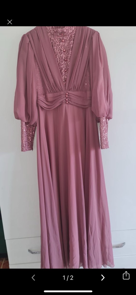 Bu uzun abiye elbise, drapeli tasarım, V yakası ve uzun kollara sahiptir. Bol kesimli ve pastel pudra pembe renkte olup, düğünler için modern klasik stilde şık bir tercihtir. Manşetleri payet detaylıdır.