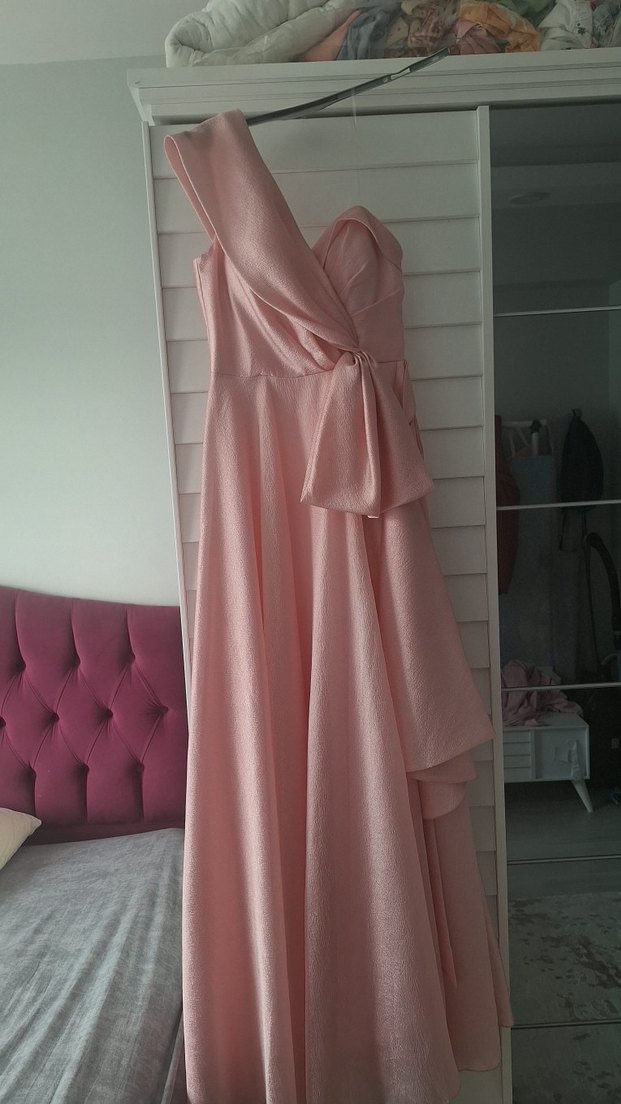 Pudra Pembe Drapeli Uzun Abiye Elbise