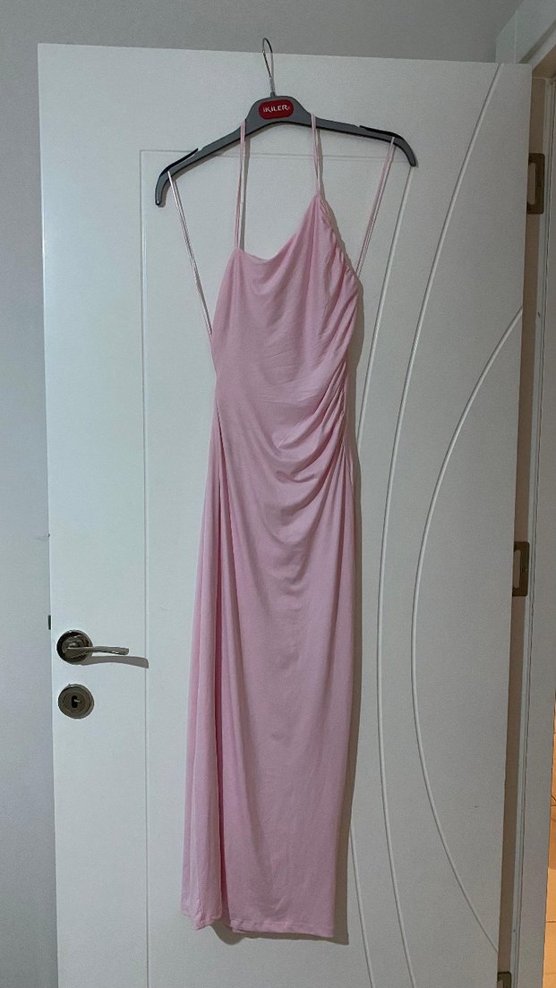 Pudra pembe renkte, drapeli ve askılı uzun elbise. Straplez yakası ve vücuda oturan kesimiyle parti için uygun. Yumuşak sentetik kumaştan yapılmıştır.