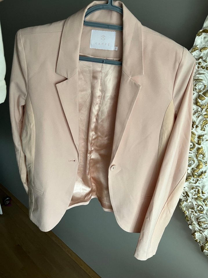 Pudra pembe renkte, tek düğmeli, ipeksi dokulu , saten astarlı kadın blazer ceket. Normal boy, uzun kollu, klasik modern tarzda, ofis için uygun.Kaffe markalı bir kere giyildi .