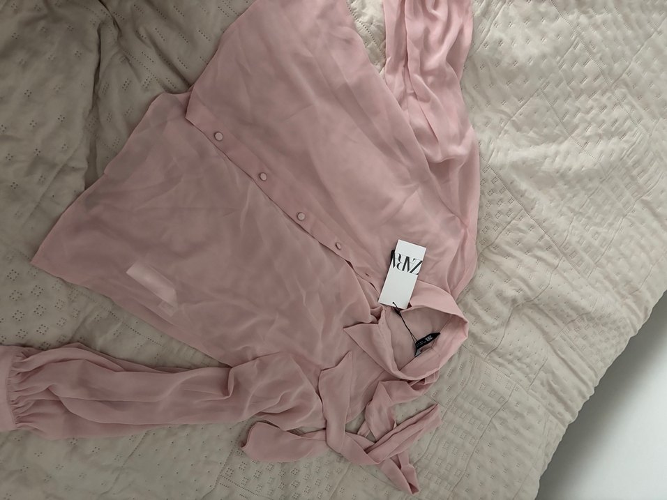 Pudra pembe, düğmeli, uzun kollu, V yakalı kadın gömleği. İpek dokulu kumaştan, bol kesim ve midi boyda, sokak modasına uygun.transparan