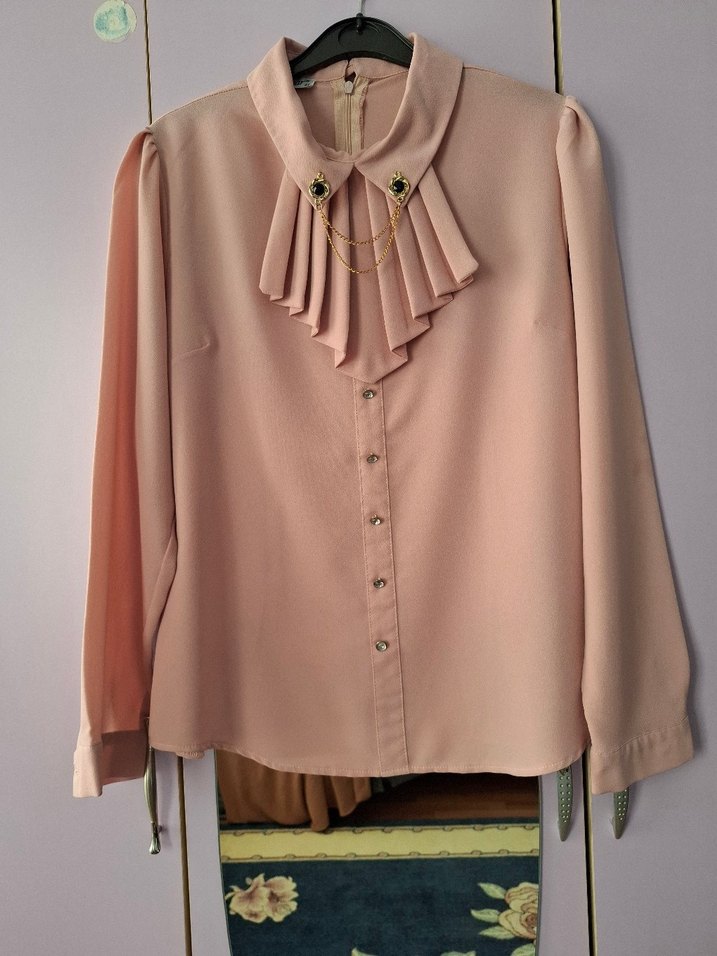Pembe pudra, uzun kollu, düğmeli ve yakalı kadın gömleği. İpek dokulu kumaş ve zincir detaylı fırfırlı tasarım, ofis için uygun. Bir kaç kez giyildi çok iyi durumda yırtığı söküğü yok. Fiyatlarda yardımcı olurum Teklif vermeyi unutma Keyifli alışverişler :)