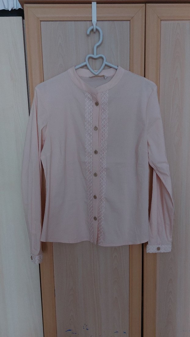 düğmeli, yuvarlak yakalı, pudra pembesi renkte uzun kollu kadın gömleği. hafif dantel detaylar içerir. etiketinde 42 beden ama kalıbı çok geniş değil M/L uyumludur. İncedir