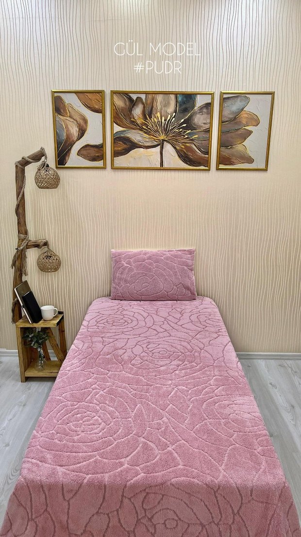 Pastel pudra pembesi renkli, kabartmalı çiçek desenli yatak örtüsüdür. Üzerinde uyumlu yastık kılıfı ve çarşafı bulunmaktadır.
