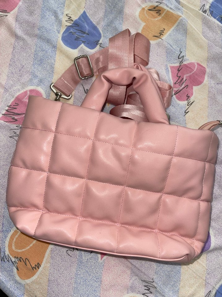 Pudra pembesi tonunda, tokalı askılı ve yumuşak sentetik kumaştan yapılmış, kapitone desenli kadın omuz çantası. Trendy casual ve sokak stiline uygun.