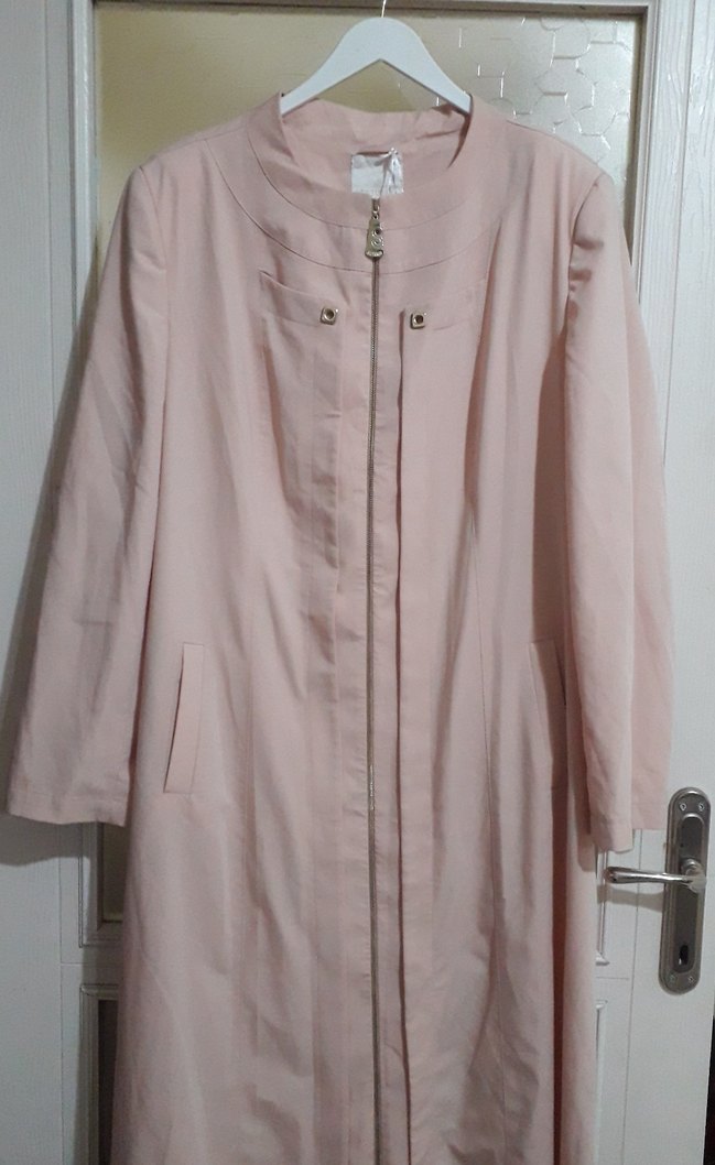 Pastel pembe uzun kaban, yakasında çıtçıt düğmeli, sentetik kumaştan, uzun kollu ve regular fit. Günlük kullanım için uygun.