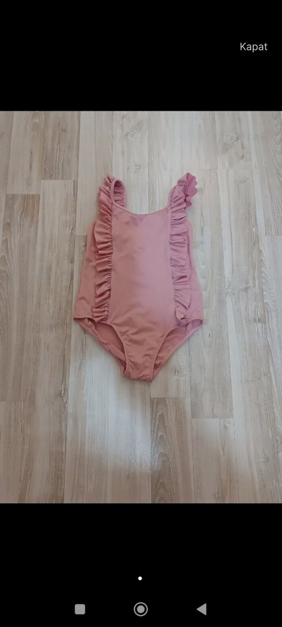 Pudra pembesi kız çocuk mayosu, askıları fırfırlı ve desensiz, plaj için uygun sade tasarıma sahiptir. Ürün temiz az kullanıldi.Marka DAGİ beden 11 - 12 Yaş