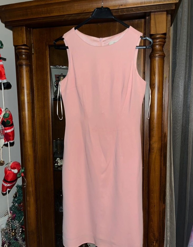 Pudra pembe, kolsuz krep elbise.
