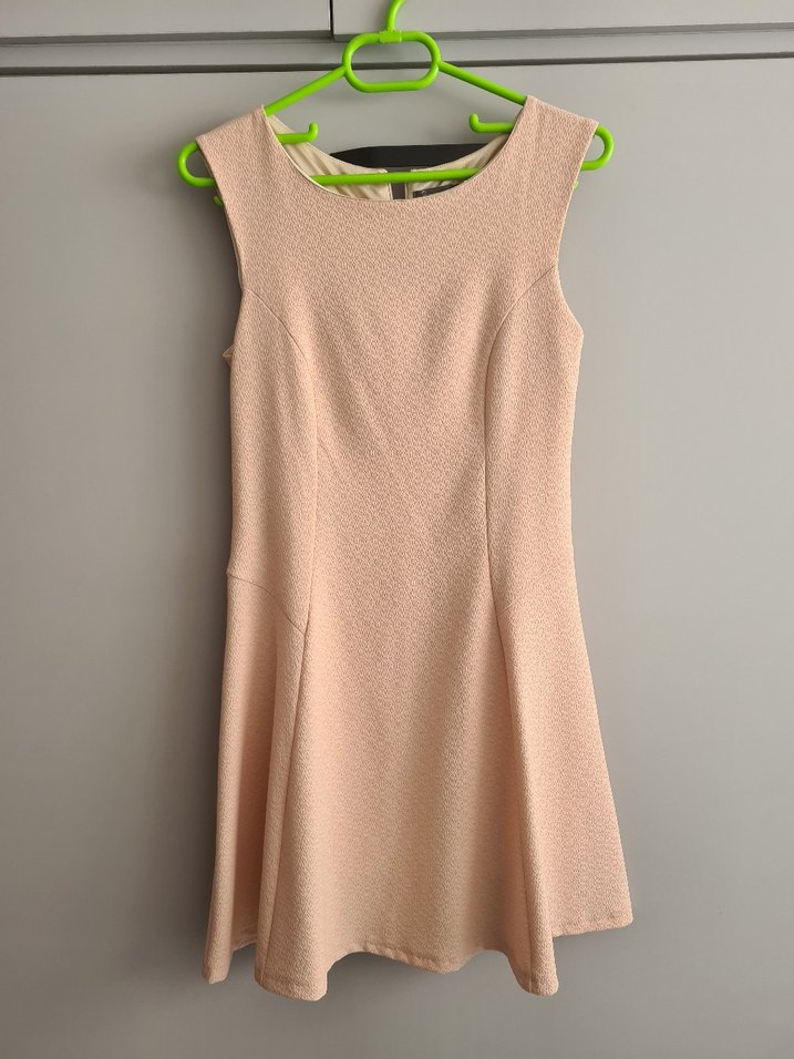 Kolsuz, pudra pembe elbise, bisiklet yaka. vücuda oturan kesimle minimal tarzda. ofis kullanımı için uygun.