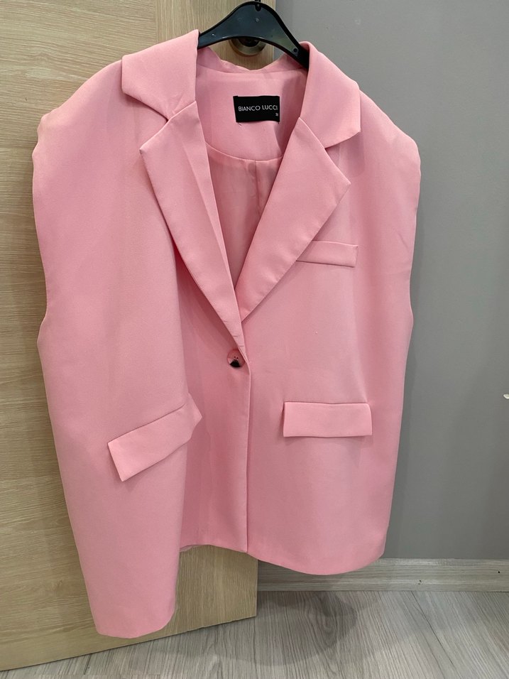 Pudra pembesi kolsuz mini blazer, yakalı ve düğmeli tasarıma sahiptir. Sentetik kumaştan yapılmış, ofis için uygun rahat ve şık bir parçadır. Ortadan kemerle takabılırsınız