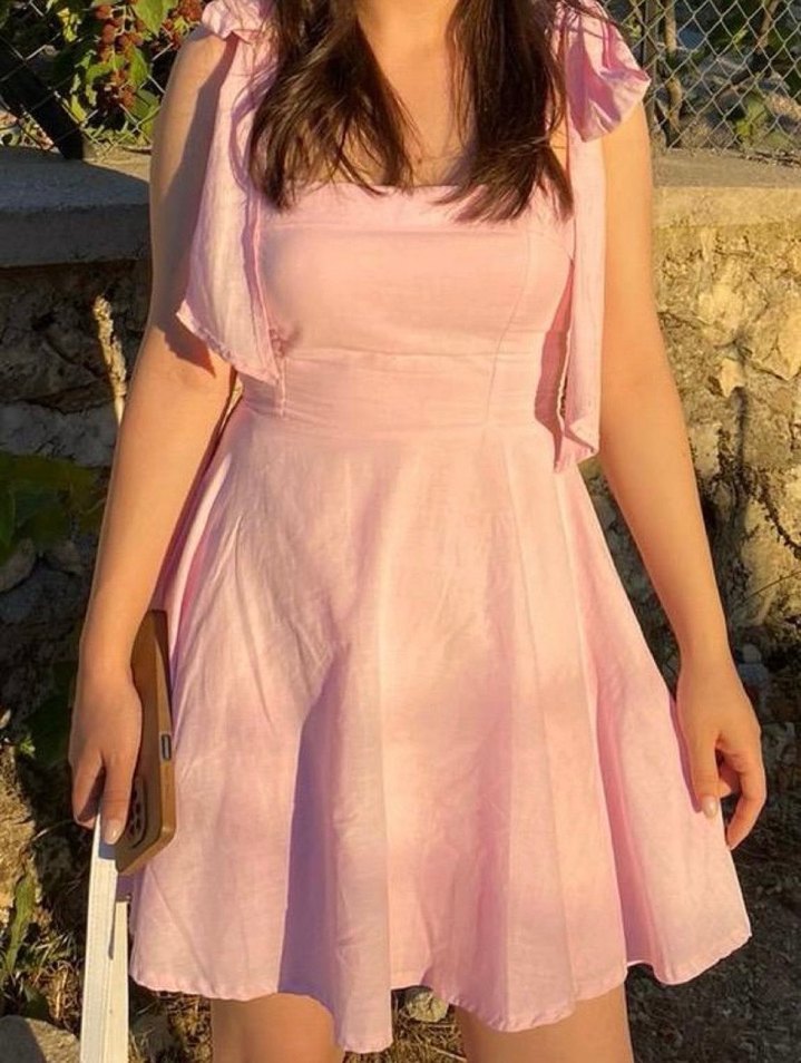 Pudra pembe keten kumaştan, askılı ve drapeli yakaya sahip, rahat kesim midi elbise. Günlük sokak stili için uygun .