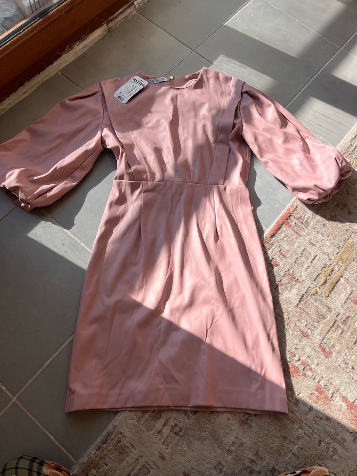 Pudra pembe renkte, yarım lastikli kol ve drapeli tasarıma sahip, v yaka midi elbise. Deri kumaştan, günlük kullanım için uygun ve modaya uygun sokak stiliyle uyumlu.