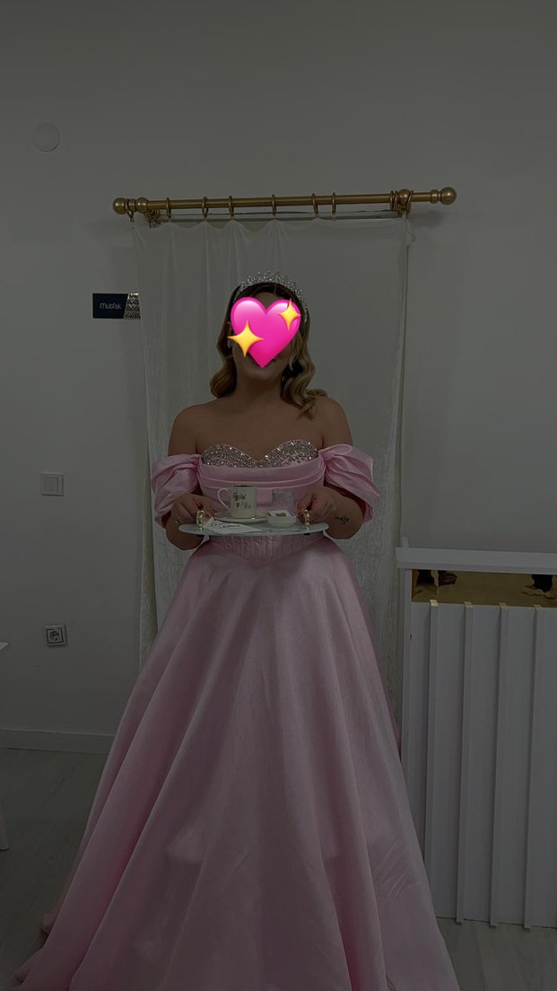 Pudra pembe renkte, straplez yaka ve drapeli uzun kollu, vücuda oturan nişan elbisesi. Önü taşlı bir kere nişanımda kullandım hiç bir sorunu yoktur sorunsuz kuru temizlemesi yapıldı 38-40 bedene uygundur harika prensesler gibi duruyor