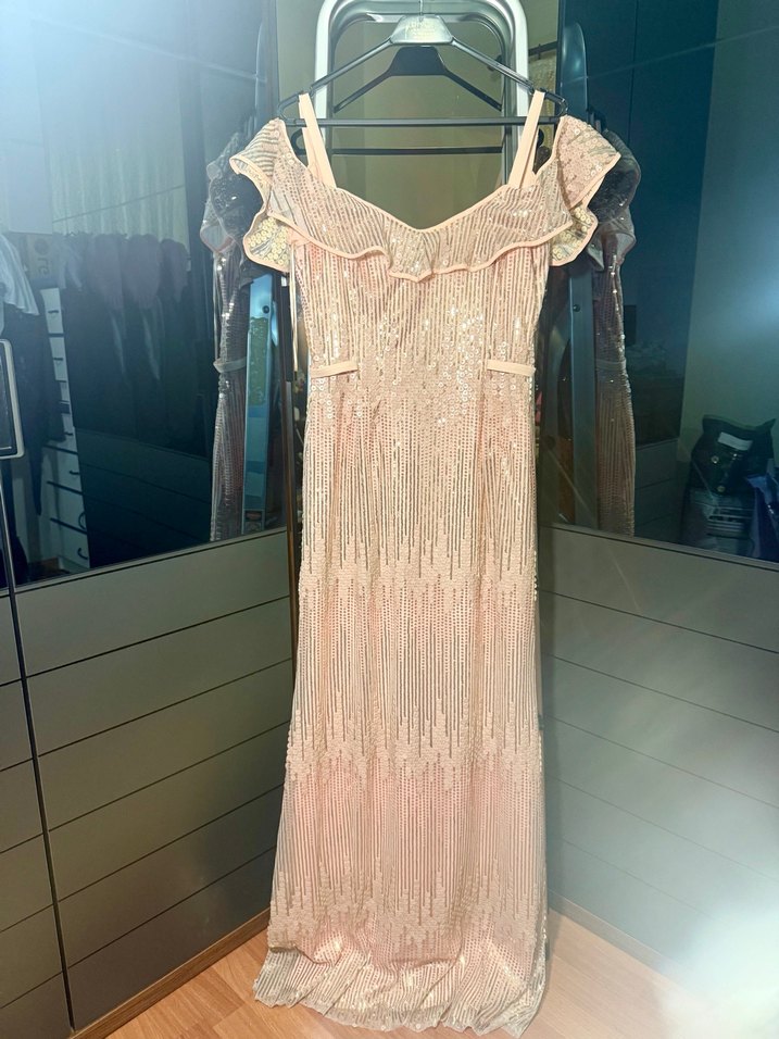 Pudra pembe payetli Uzun omuz detaylı Abiye Elbise