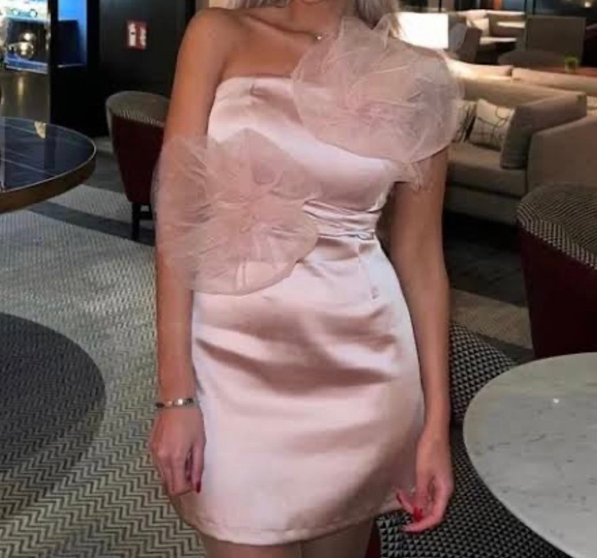 Pudra pembesi straplez, drapeli ve vücuda oturan midi boy abiye elbise. Kolsuz ve desensiz, çağdaş ve göz alıcı bir tarz sunar.