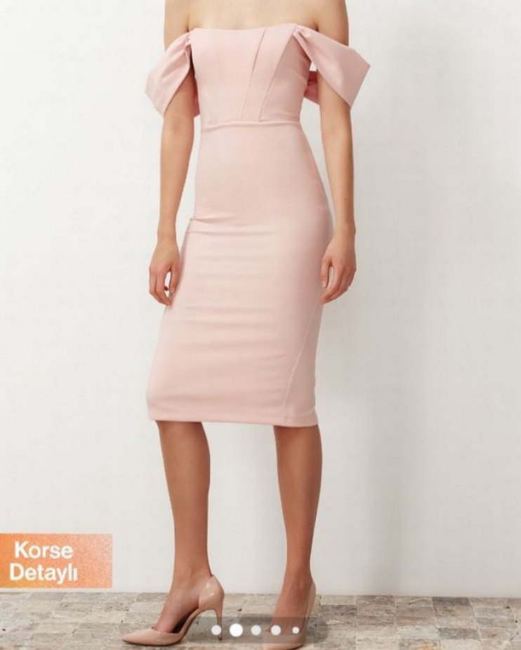 Pudra pembe, straplez ve askılı kollu, midi uzunlukta kalem elbise. Yumuşak sentetik kumaştan, modern klasik, desensiz ve zahmetsiz şıklık sunar. 1 kere giyildi. Sorunu yoktur