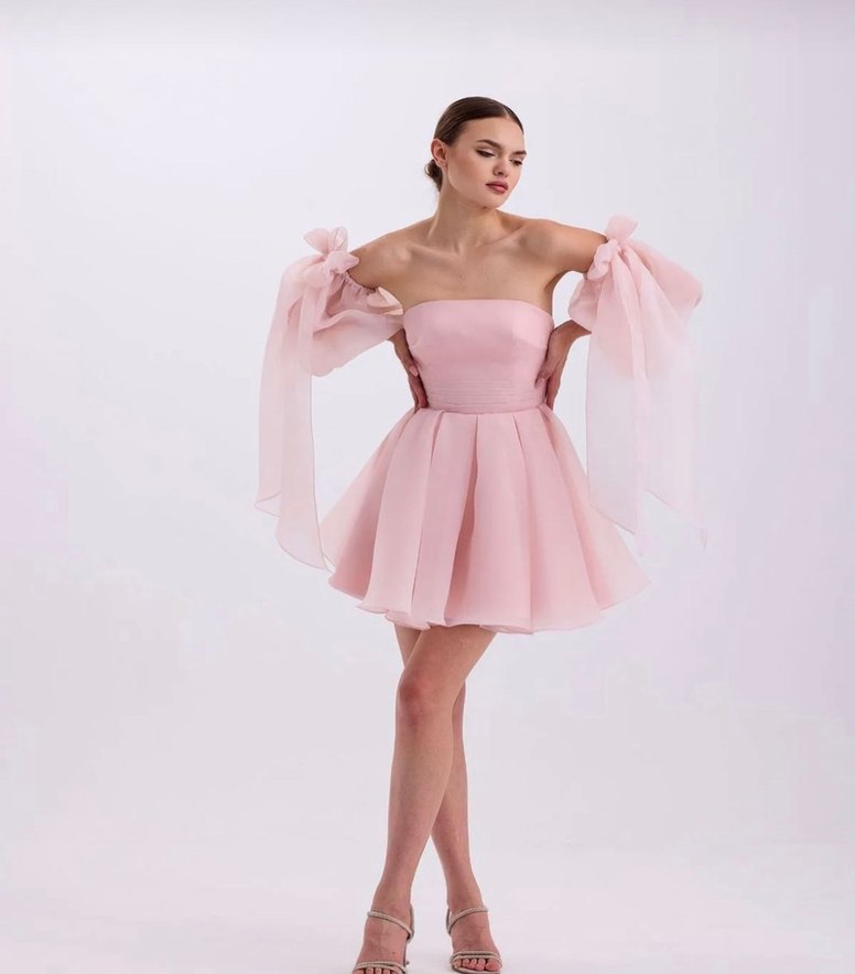 Pudra Pembe Straplez Mini Abiye Elbise