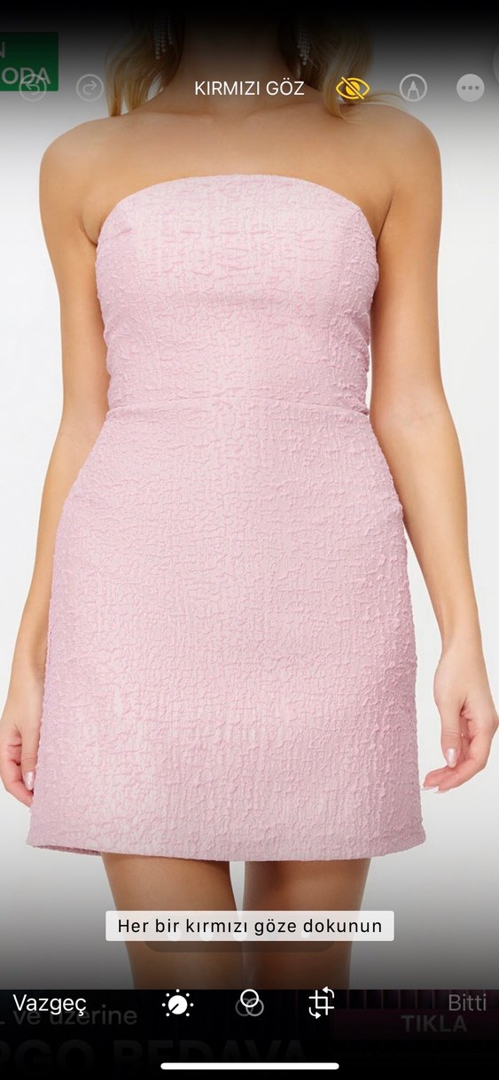Pudra pembesi tonlarında, straplez ve dantel detaylı, vücuda oturan mini elbise. Yumuşak sentetik kumaştan, romantik akşamlar için ideal.